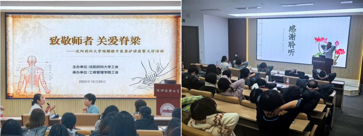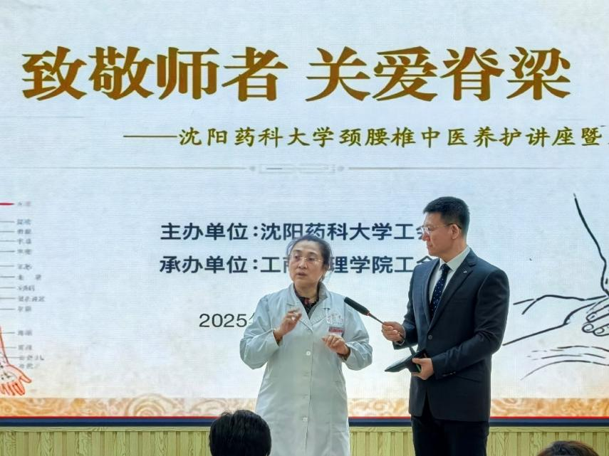值此重阳佳节来临之际,为弘扬尊师重教传统、关爱师生身心健康,10月29日,由校工会主办、工商管理学院工会承办的“致敬师者 关爱脊梁——沈阳药科大学颈腰椎中医养护讲座暨义诊活动”在热烈氛围中圆满举行。校工会副主席王延风、工商管理学院党委书记王双艳以及工商管理学院工会主席刘皓出席活动。