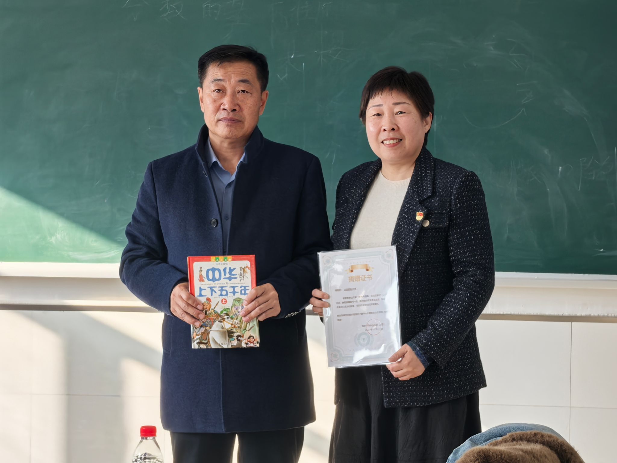 (何忠喜为校工会颁发捐赠证书) 此次捐书活动是学校第三届“厚植文化沃土 奋进荣药征程”文化节教职工协会活动月收官之举。校工会根据“漂书传温情 文化促振兴”捐赠书籍活动的指导思想,将教职工捐赠的涵盖文学经典、科普读物等书籍800余册捐赠给双井子镇中心小学,助力构建乡村学子的“流动图书馆”。本次捐书活动也作为档案馆工会党支部主题党日活动,以党建融合教育帮扶,是高校基层党组织巩固拓展脱贫攻坚成果、助力乡村全面振兴的具体行动。